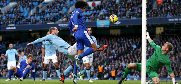 Everton’s Marouane Fellaini scores his side’s first goal of the game